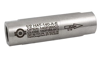 A thermal wax actuator mechanically operates ThermOmegaTech’s self-operating HAT (heat actuated trap) valve. This thermostatic actuator senses the fluid temperature and will modulate the valve open to initiate flow if the temperature falls below the valve’s set point. Once the fluid temperature increases back to the set-point, the valve will modulate closed to control flow. HAT valves are available with built-in leakage to allow bypass flow.